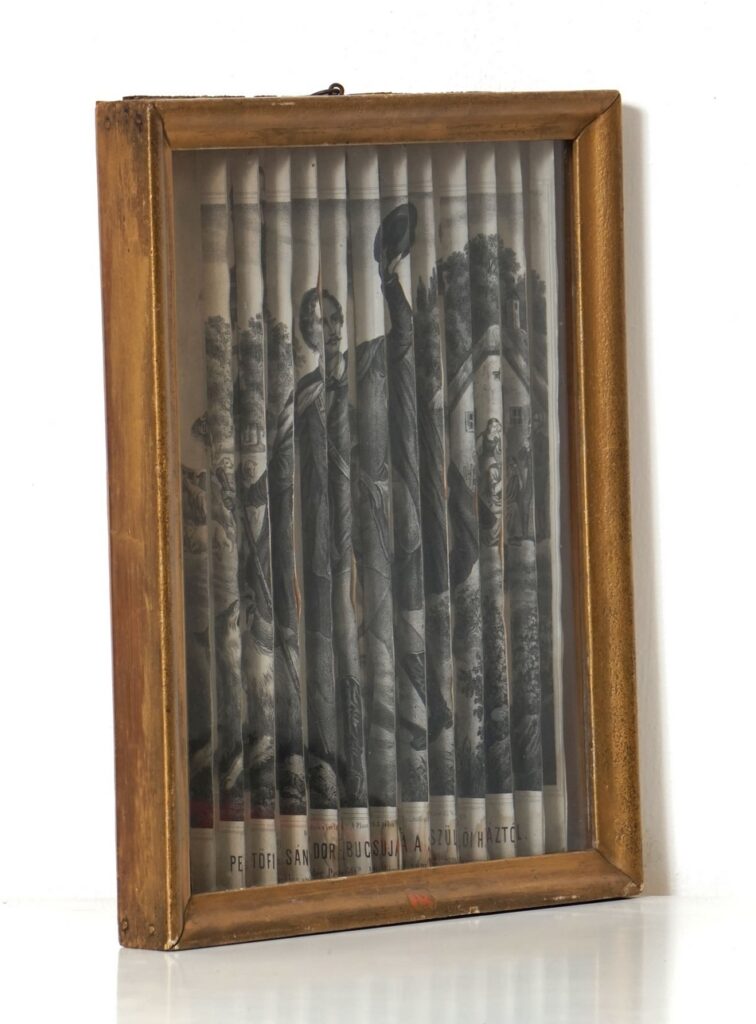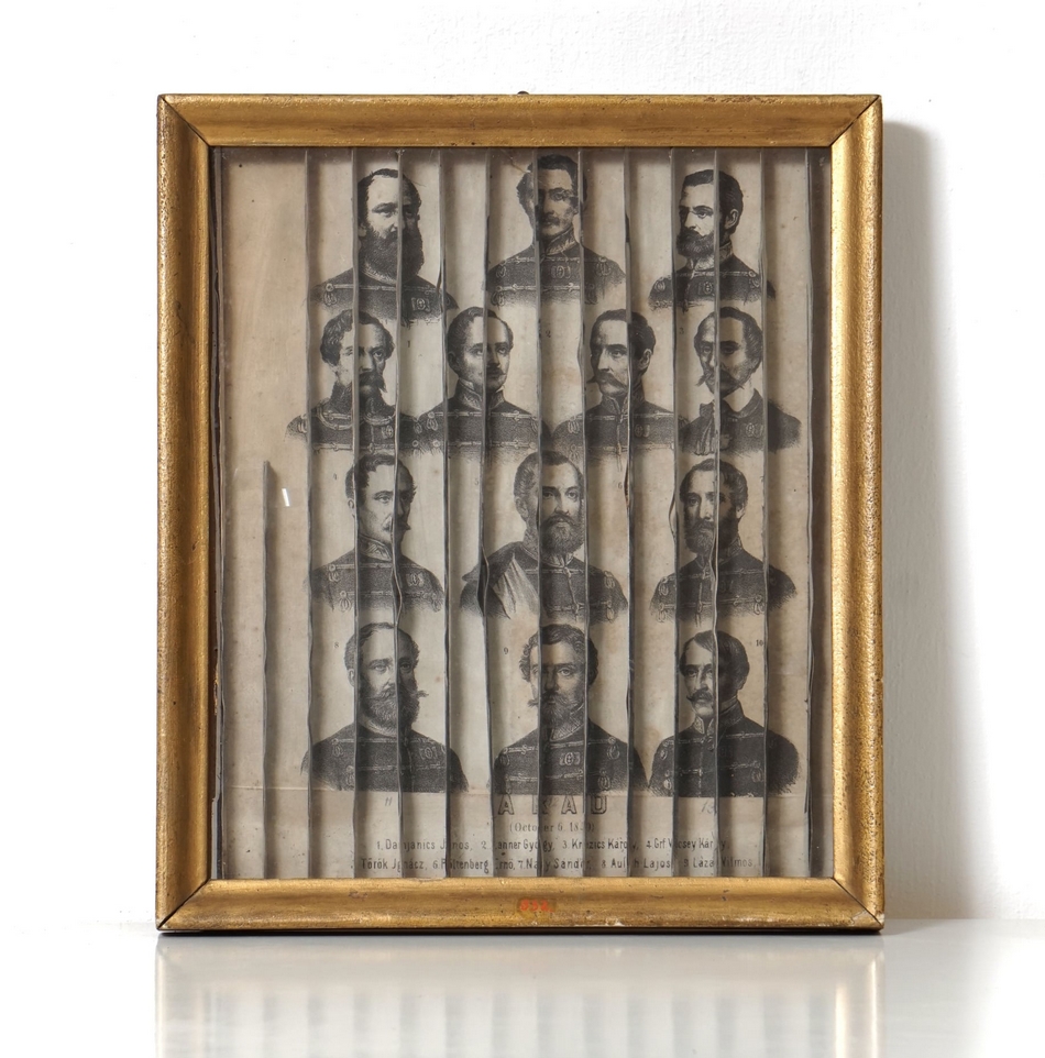 Szemből az aradi 13 vértanú képe látható, jobbról nézve Kossuth Lajos arcképe rajzolódik ki, balról állva pedig a búcsúzó Petőfi integet felénk. Kossuth és Petőfi rajzolata csíkokra vágva kerültek összeragasztásra, majd a megfelelő sorrendben ráhelyezve a vértanúk nyomatára.