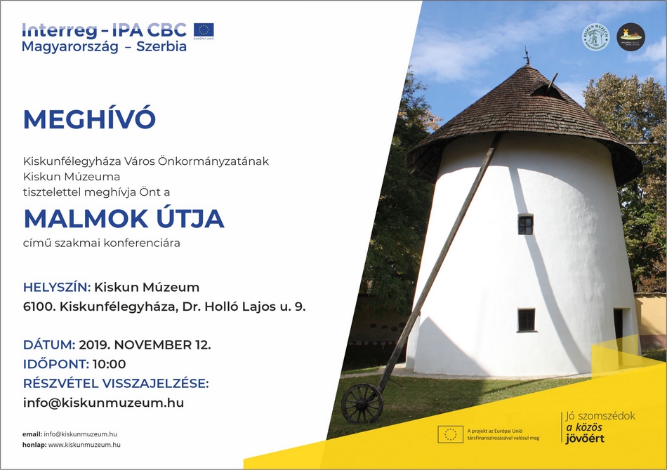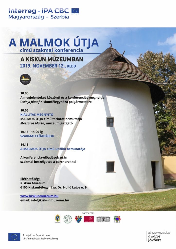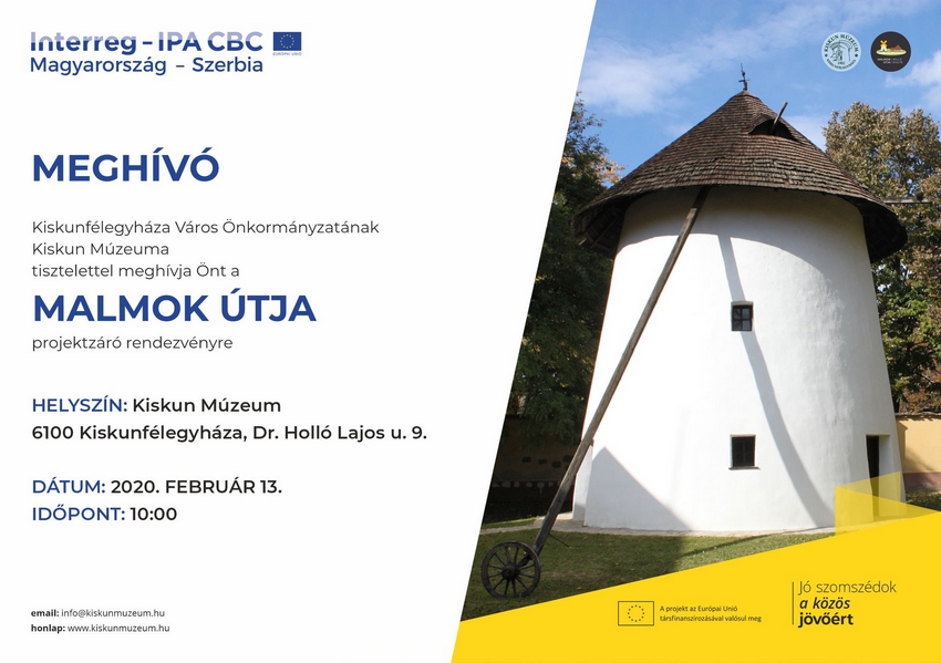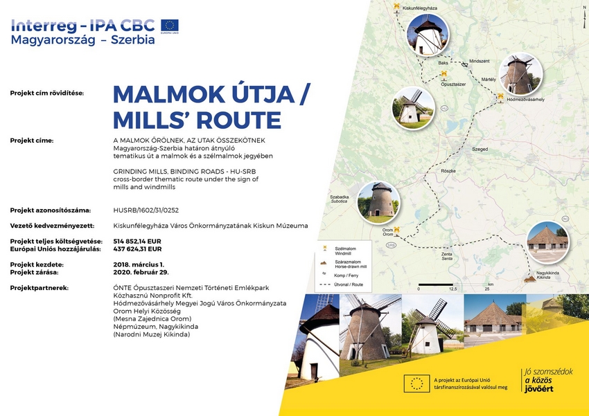 Projekt leírása: Az Alföld egykor híres gazdasági építményeit, a malmok bemutatását tűzte célul a határon átívelő projekt. A kenyeret adó gabona őrlésére többféle technikát fejlesztettek ki, amelyek meghonosodtak, elterjedtek e vidéken. Az alföldi tornyos szélmalmok mellett szárazmalmok és különböző darálók is megtalálhatók még ma is. Megmentésük, megőrzésük és megismertetésük nagyon fontos, hiszen több mint 200 évig e vidék meghatározói voltak. A projekt öt település összefogásával (magyar és szerb részen is) megtalálható, ma is látható malmokat fűzi fel egy tematikus út keretében. Az Alföld megőrzött emblematikus gazdasági építményeinek többsége ma már műemlék, védett, ezáltal jól demonstrálja az egykori világot. A sokszínűség és a technikai változatosság mutatható be a tematikus út során, mint több típusú szélmalom, szárazmalom, széldarálók és paprikaőrlő malom is. A megmentésre és felújításra váró malmok adtak ötletet a pályázati összefogásra. A öt település mindegyikében található egy-egy malom, melynek megőrzése mellett fontosság vált a bemutatása. A Malmok útján keresztül tematikusan mutatjuk be az öt település turisztikai értékeit. A projekt ideje alatt minden helyszínen sokszínű rendezvények – a tudományos-szakmai találkozótól a családi rendezvényekig, fesztiválokig várják az érdeklődőket, kapcsolatokat építve és erősítve a partnerek és településeik között.