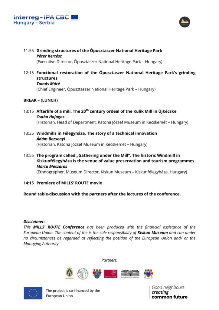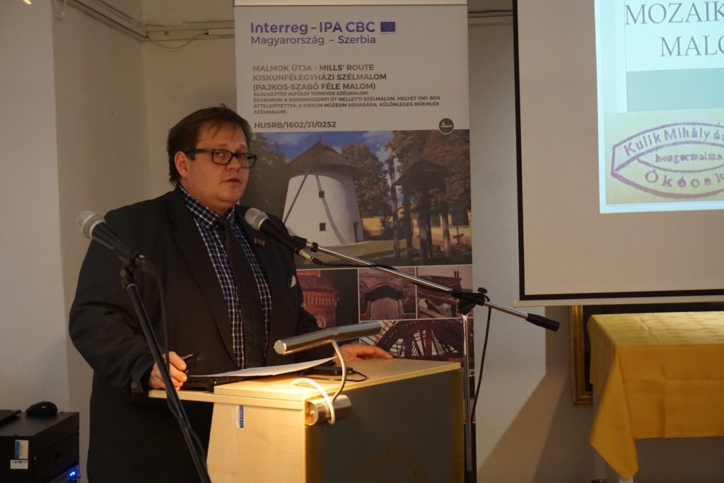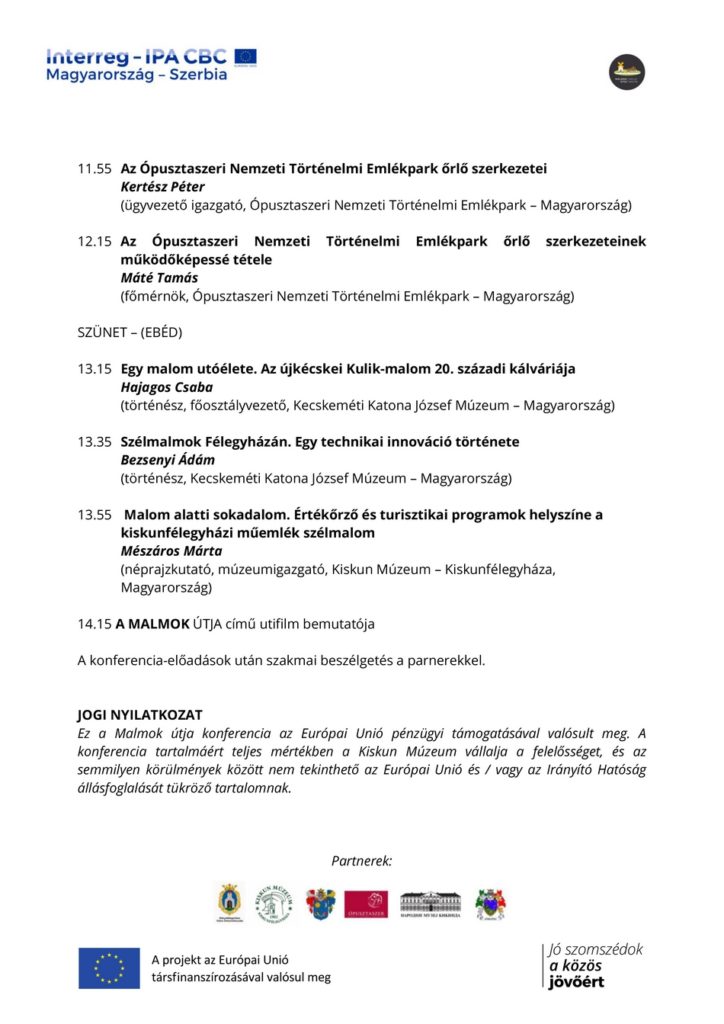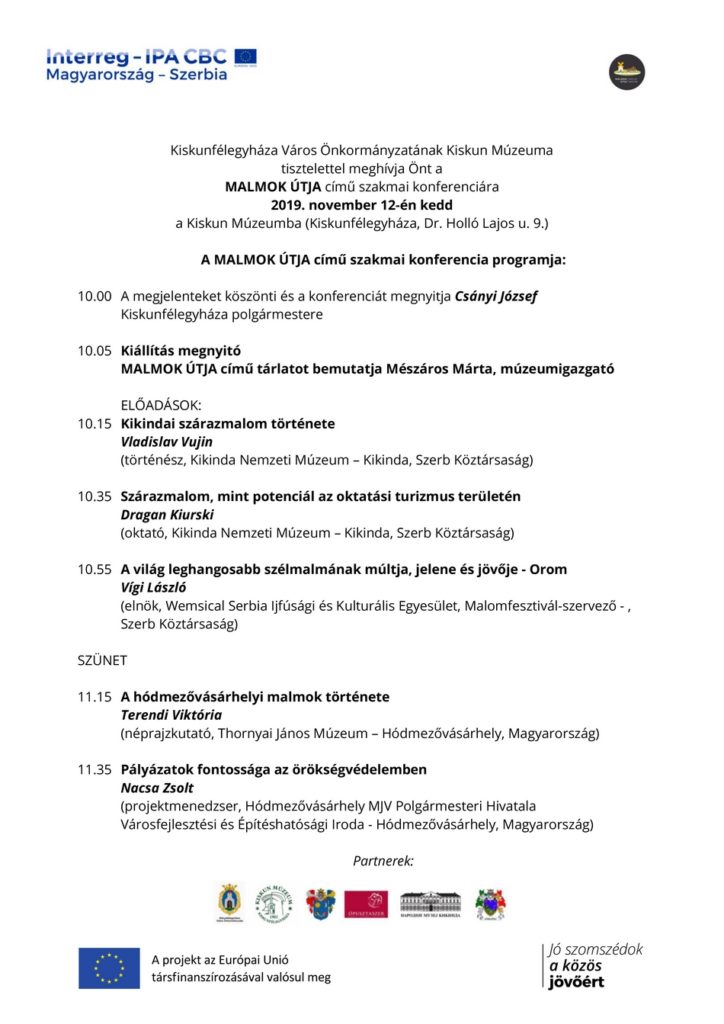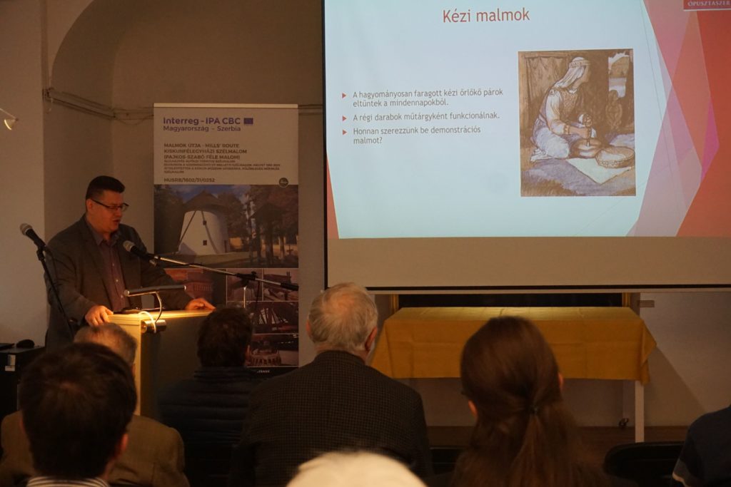 18 órától a konferenciatermünkben előadásokat hallhattak az érdeklődők: – A „Malmok Útja Kiskunfélegyházától Kikindáig” címmel a projektet bemutatta Mészáros Márta múzeumigazgató – A Pajkos – Szabó szélmalom történetéről tartott előadást Kovács Nándor, a Kiskun Múzeum munkatársa Bemutatásra került az a kisfilm, mely a Malmok útját, az öt településen található malmokat járta végig.Végezetül a műemlék szélmalom felújításáról tart ismertetőt Vidéki Zsolt, a Bács-Ép-Generál Kft. ügyvezetője